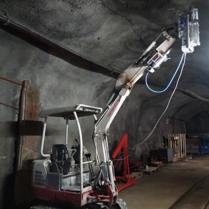 Die seismische Impulsquelle SQ5 liefert als pneumatisch betriebener Impakthammer reproduzierbare Schläge mit einer Energie von ca. 140 Joule bei einem Arbeitsdruck von 7 bis 8 bar. Das kompakte Gerät, das über einen integrierten Zustell-/Anpresszylinder verfügt, ist sowohl für den Einsatz auf Tunnelbohrmaschinen als auch für die Montage auf einem Trägerfahrzeug (z.B. Bagger, Radlader) geeignet. Die Quelle ist vor allem für den Einsatz im Hartgestein oder auf festen Oberflächen vorgesehen und kann dabei in jede Richtung anregen. Über die verbauten Lichtschranken liefert der Hammer einen zuverlässigen Triggerimpuls, um die Aufzeichnung mit dem angeschlossenen Akquisitionssystem zu starten. Die Bedienung des Hammers über eine SPS-basierte Steuerung kann, alternativ zu den verbauten Bedientasten, auch über elektronische Schnittstellen in bestehende Systeme des Kunden eingebunden werden. Die Einhaltung der Einsatzparameter wird über eingebaute Sensorik überwacht und bei Erreichen der eingestellten Grenzwerte wird das Gerät in Notaus geschaltet um einen sicheren Betrieb zu gewährleisten.